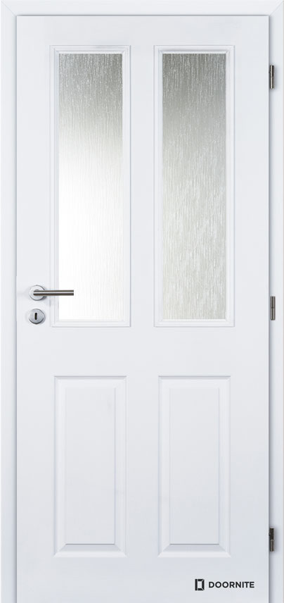 Interiérové dveře tvořené dveřním rámem z MDF materiálu oboustranně opláštěn HDF texturovanými deskami se specifickým prolisem. Nástřik bílou barvou RAL 9003 (jiné odstíny RAL za příplatek). Výplň voština.