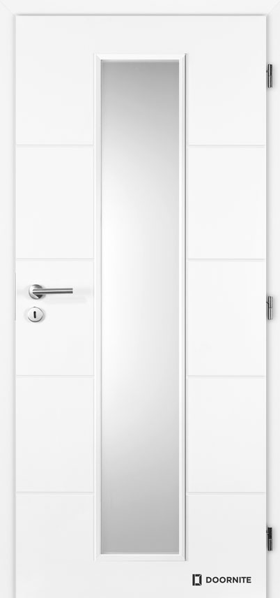 Interiérové dveře tvořené dveřním rámem z MDF materiálu oboustranně opláštěn HDF deskami se specifickým prolisem. Výplň dle výběru. Hladký povrch dveřního pláště dvakrát stříkaný bílou barvou v odstínu RAL 9003. Jiné odstíny RAL a PUR za příplatek.