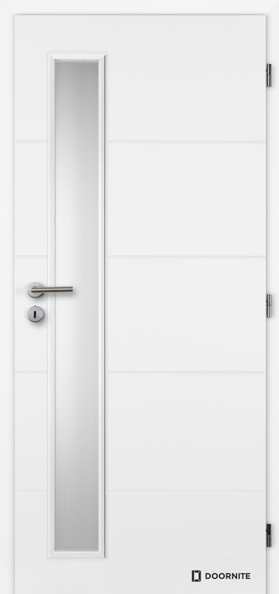 Interiérové dveře tvořené dveřním rámem z MDF materiálu oboustranně opláštěn HDF deskami se specifickým prolisem. Výplň dle výběru. Hladký povrch dveřního pláště dvakrát stříkaný bílou barvou v odstínu RAL 9003. Jiné odstíny RAL a PUR za příplatek.