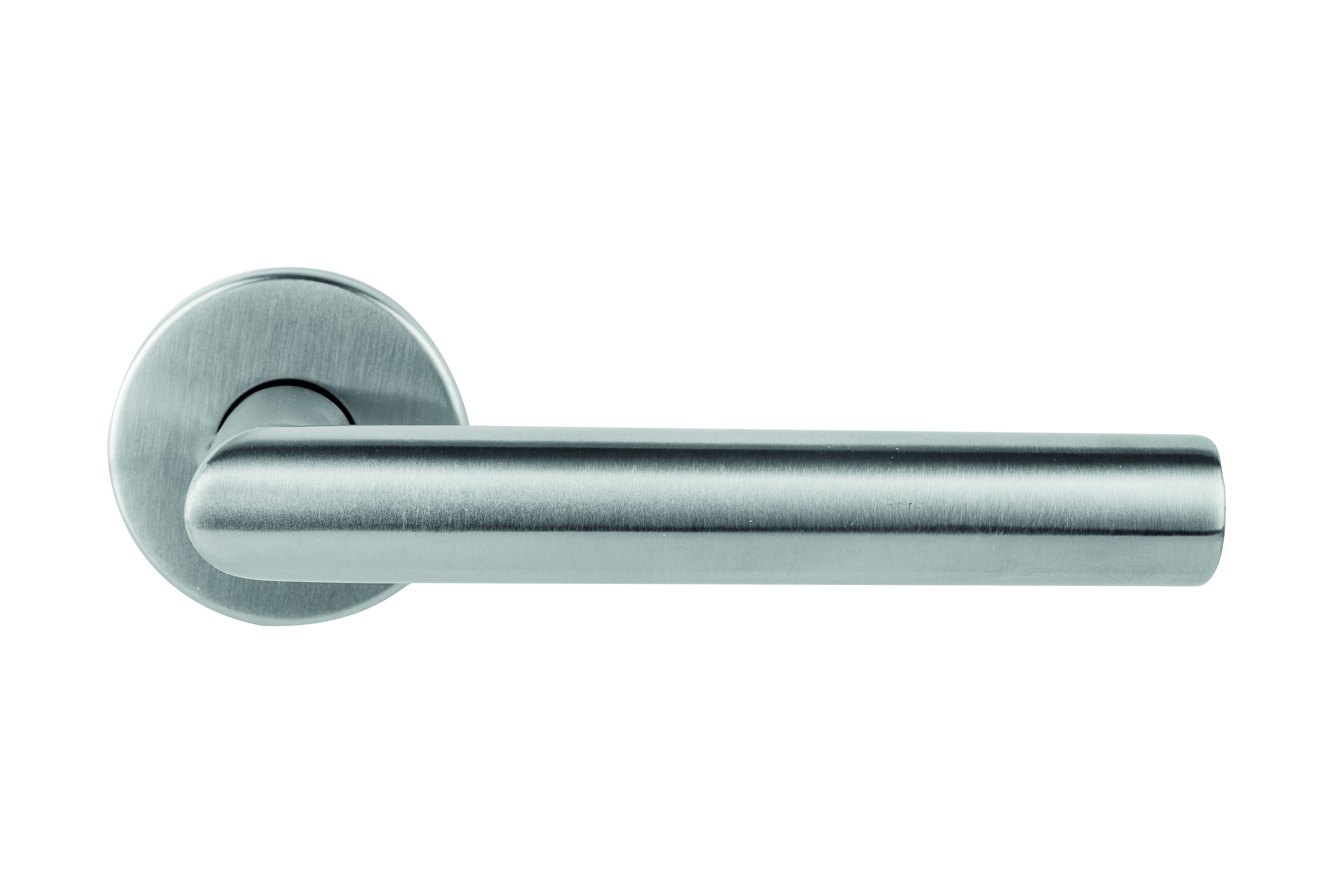 Nerezová kľučka s guľatou rozetou v povrchu nerez matný, určená do interiérových dverí štandardných hrúbok 38 -45mm.