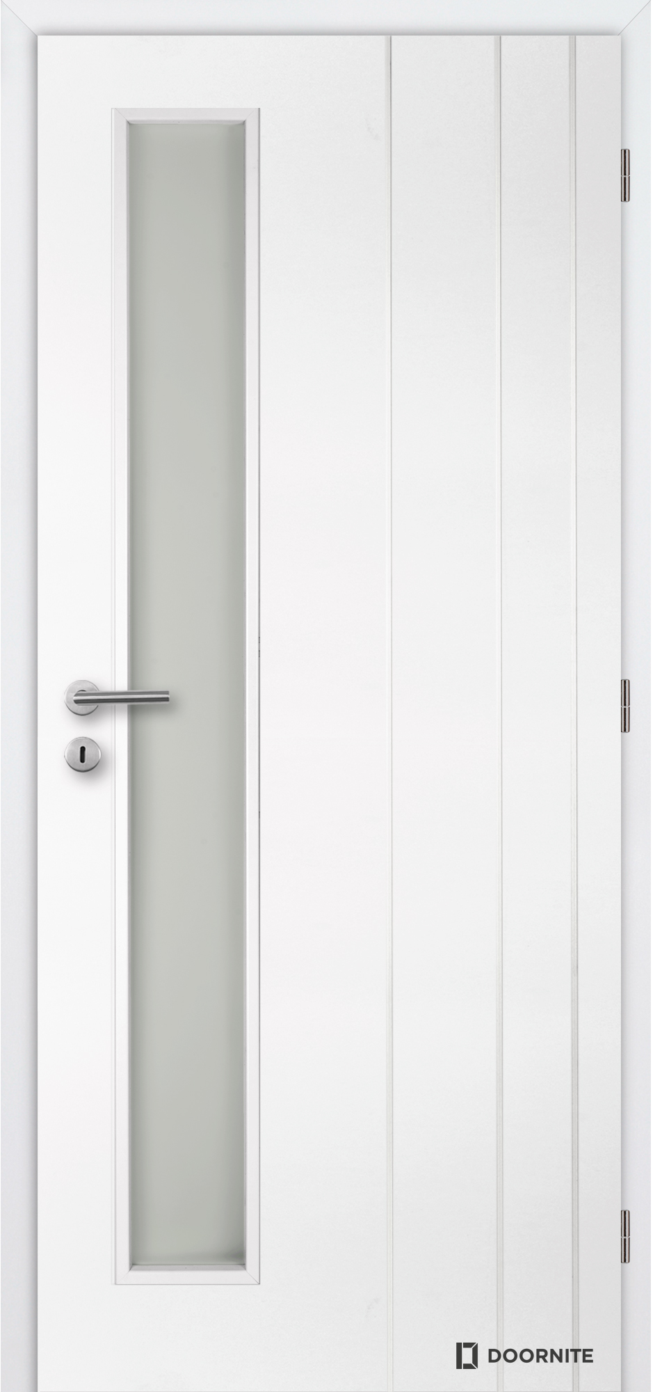 Interiérové dvere tvorené dverným rámom z MDF materiálu obojstranne oplášteným HDF doskami so špecifickým prelisom. Výplň podľa výberu. Hladký povrch dverného plášťa dvakrát striekaný bielou farbou v odtieni RAL 9003. Iné odtiene RAL a PUR za príplatok.
