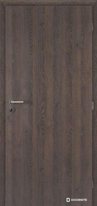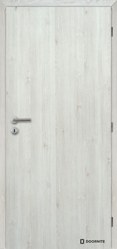 Jednokrídlové interiérové otočné plné hladké protipožiarne dymotesné dvere osadené do schválenej oceľovej zárubne s príslušným PVC šedým tesnením. Smrekový dverný rám opatrený speňujúcou protipožiarnou páskou, drevotriesková protipožiarna výplň.